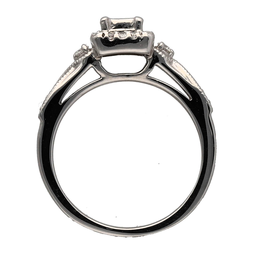 Design: The ring showcases a princess cut illusion set centre, surrounded by a sparkling diamond halo and finished with diamond-set shoulders, creating a bold yet elegant look. The total diamond content is approximately 0.38ct.