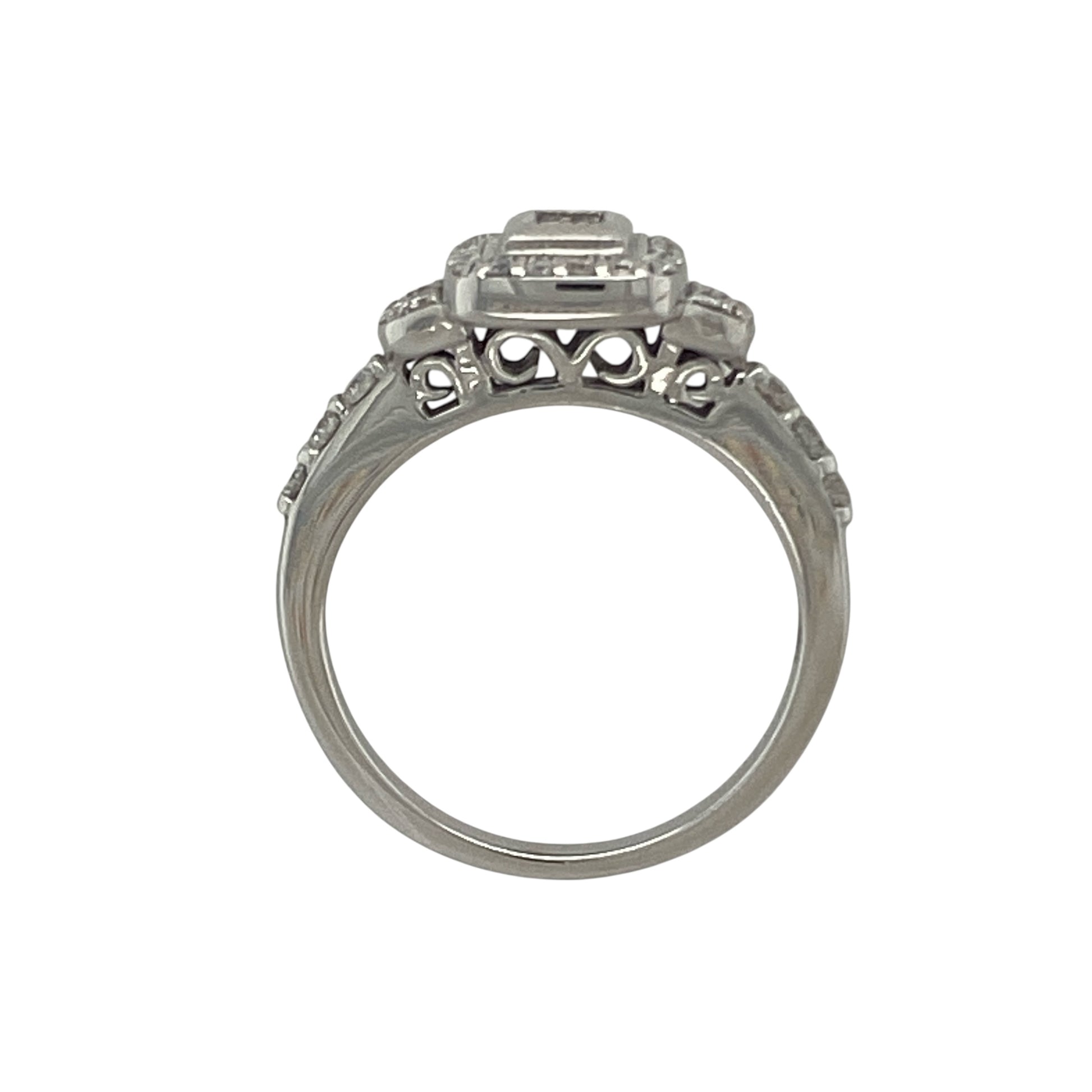 Design: The ring features a 10mm high cluster centre made up of four baguette-cut diamonds surrounded by a halo of brilliant-cut diamonds, with additional diamonds set along the shoulders. Together the diamonds total approximately 0.41ct.