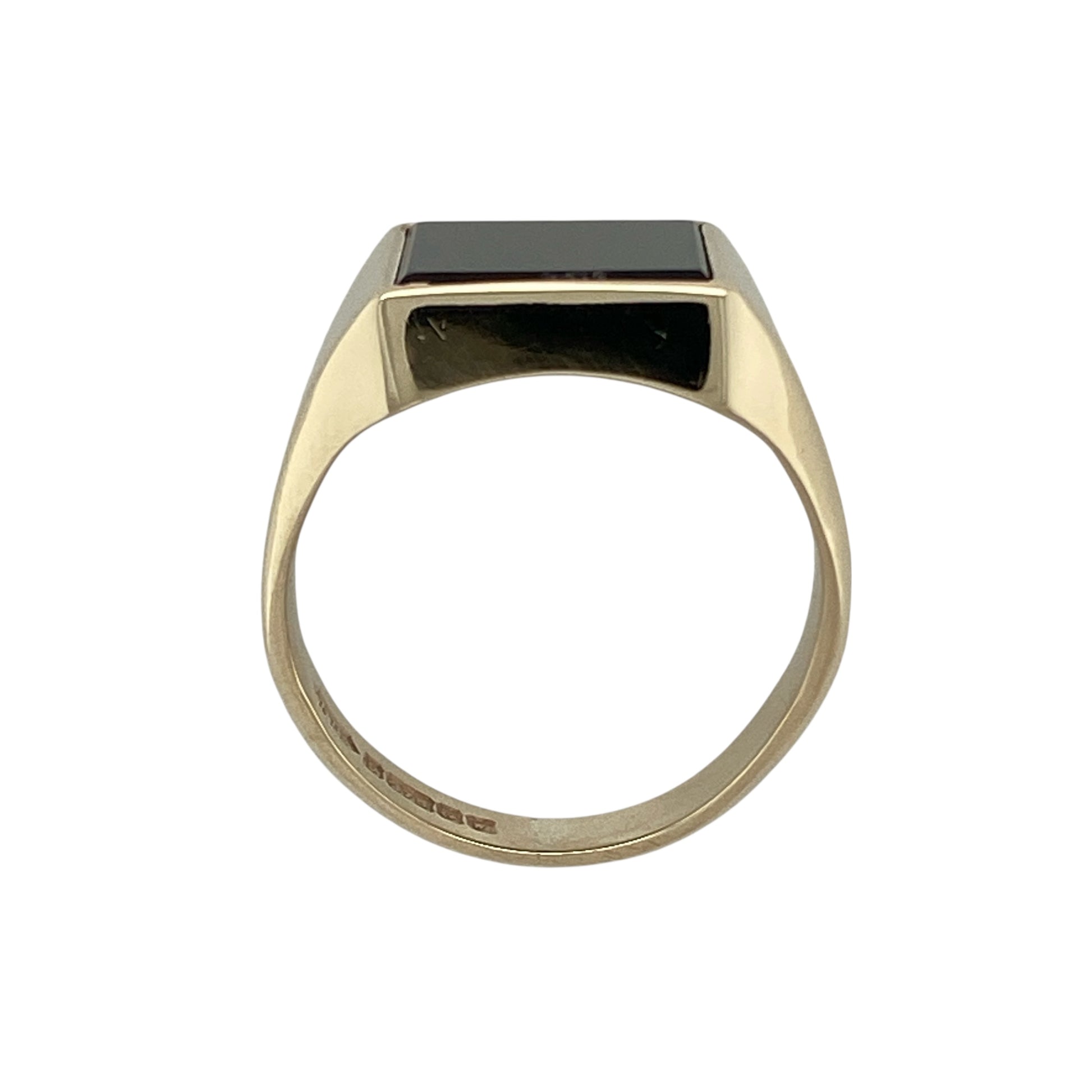 Bring bold style and classic design to your collection with this pre-owned 9ct yellow gold onyx signet ring—a timeless piece with strong presence and sophistication.