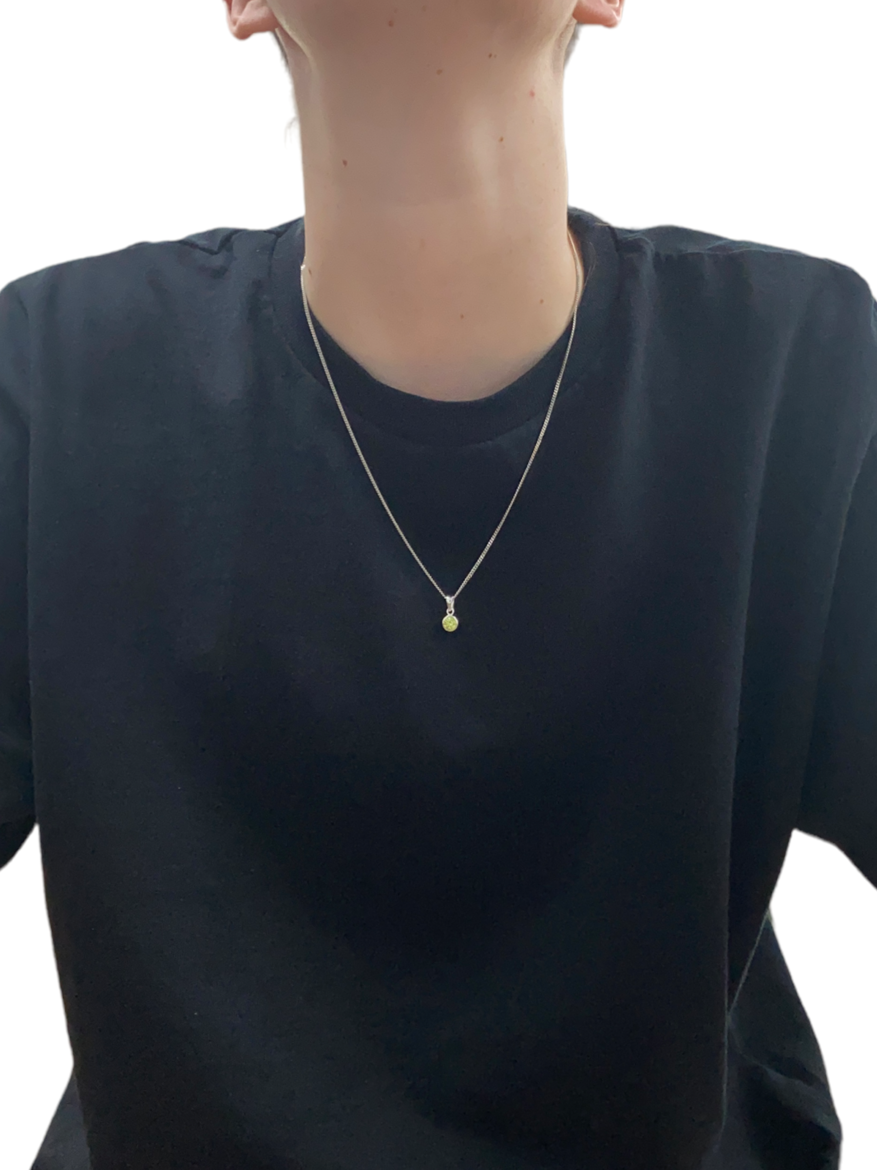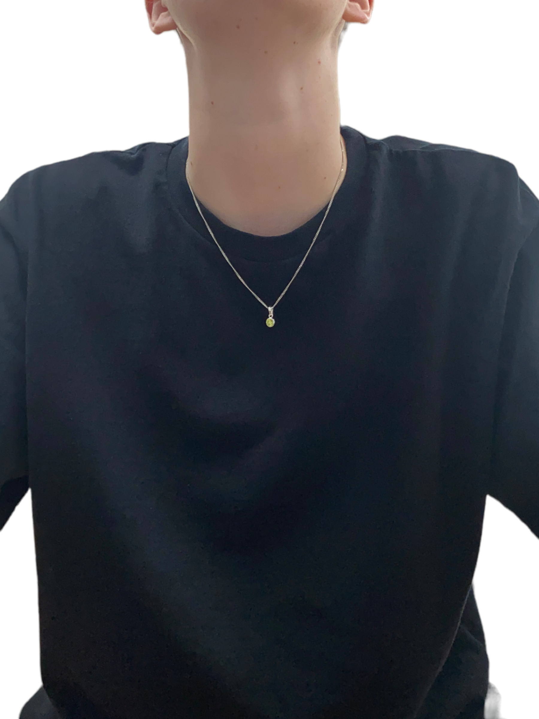 New 925 Silver August Birthstone Pendant on either an 18" or 20" curb chain. The pendant is set with a synthetic peridot stone which is 5mm diameter. The pendant is 14mm long including the bail