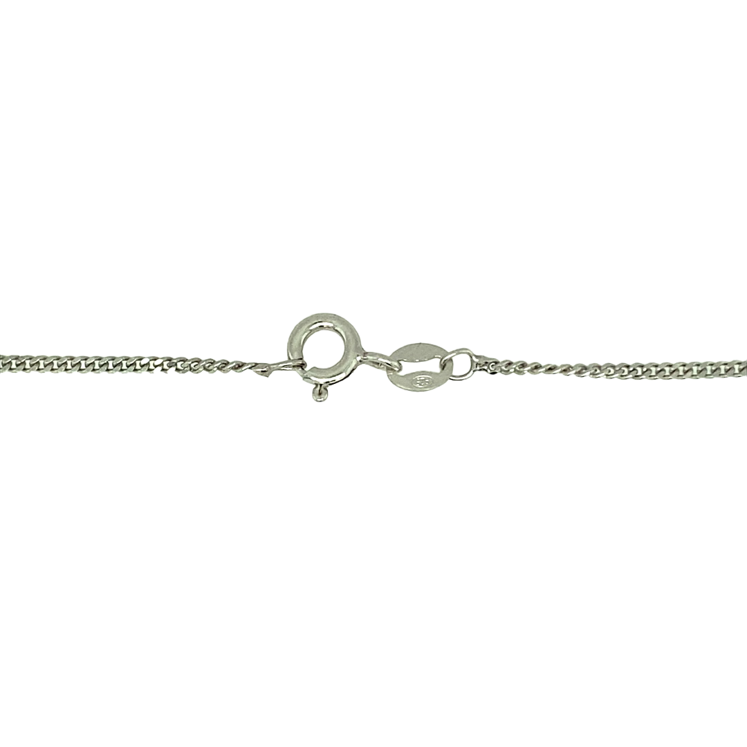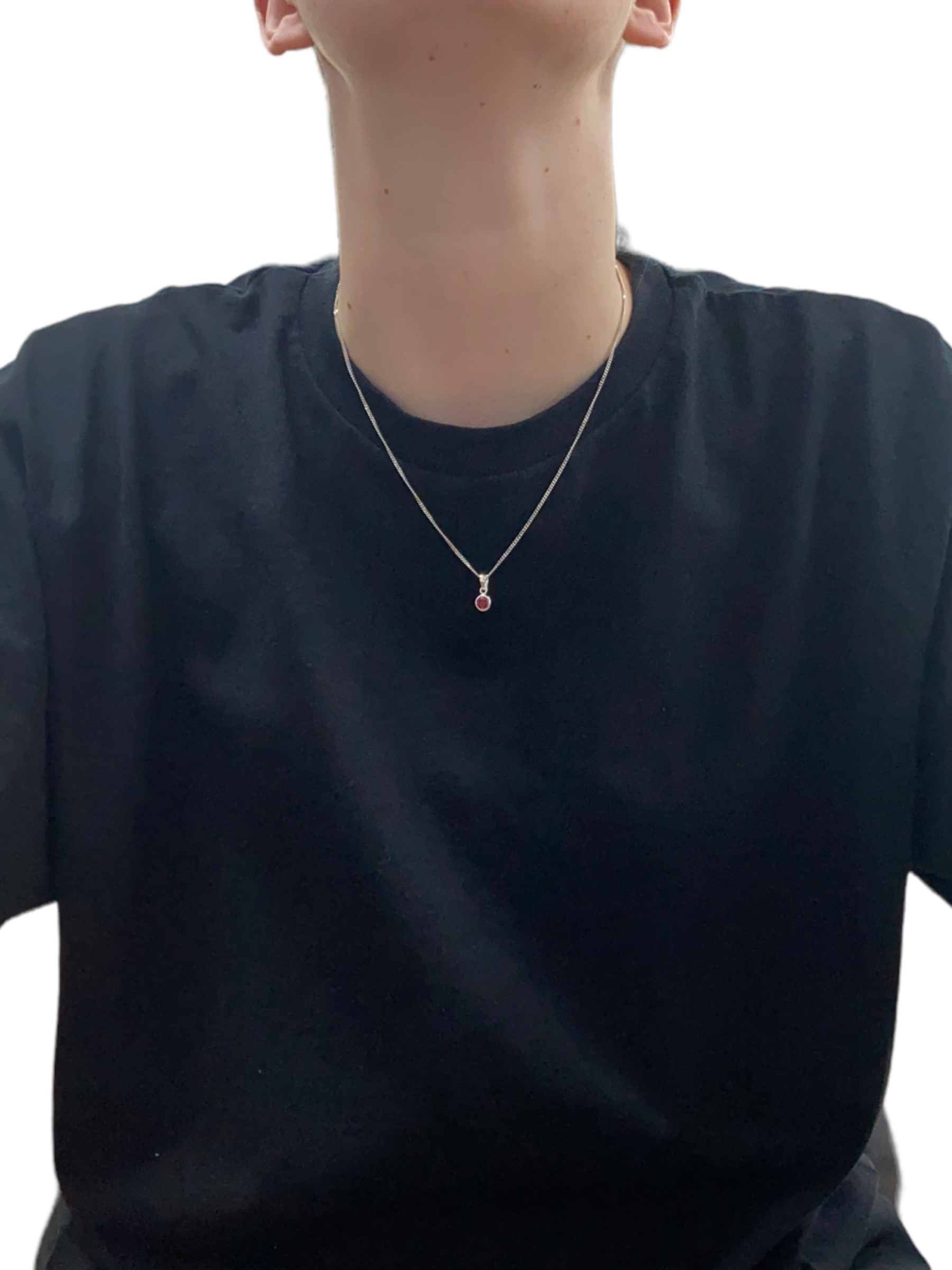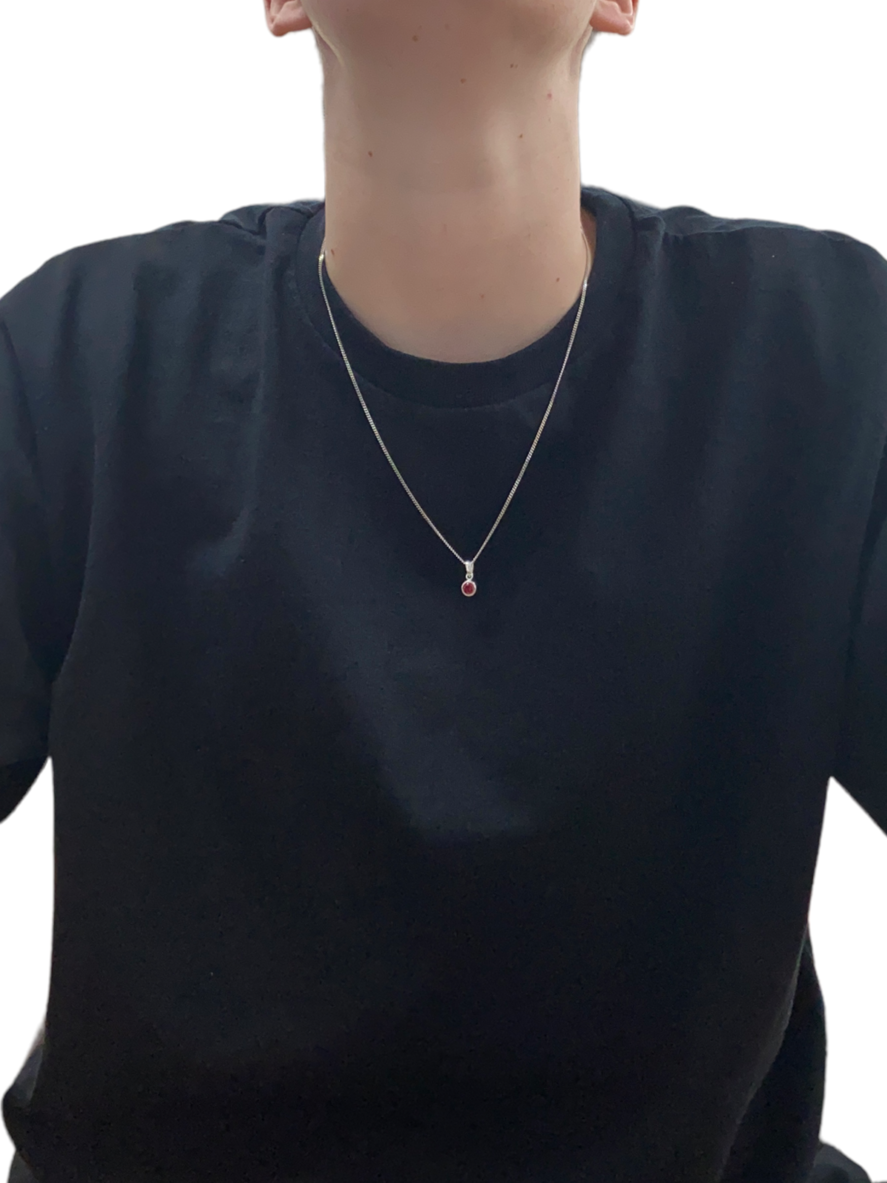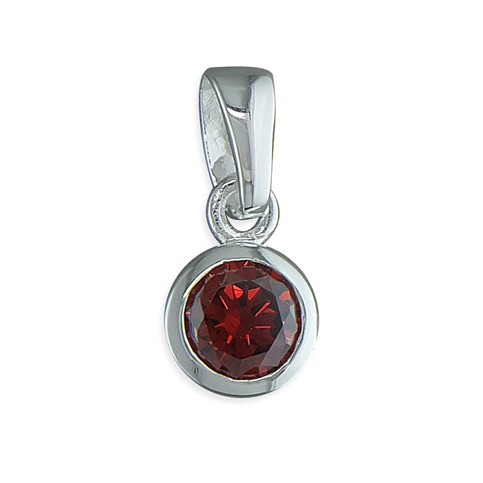 New 925 Silver January Birthstone Pendant on either an 18" or 20" curb chain. The pendant is set with a synthetic garnet stone which is 5mm diameter. The pendant is 14mm long including the bail