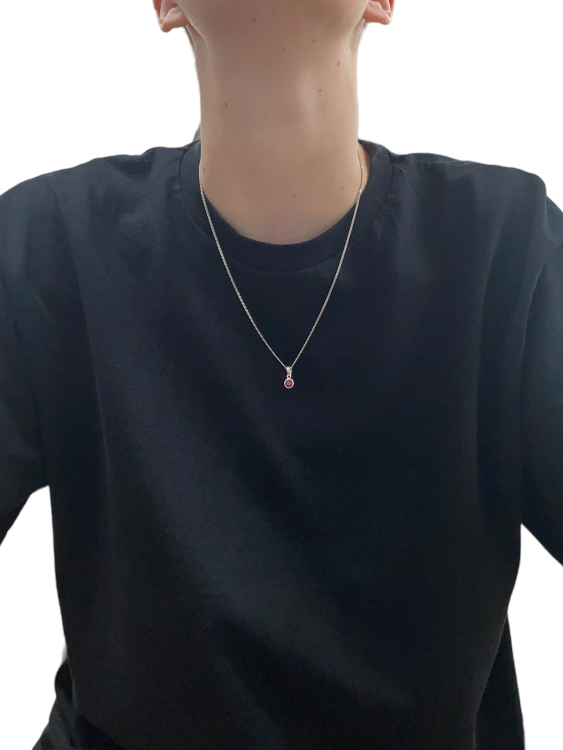 New 925 Silver July Birthstone Pendant on either an 18" or 20" curb chain. The pendant is set with a synthetic ruby stone which is 5mm diameter. The pendant is 14mm long including the bail