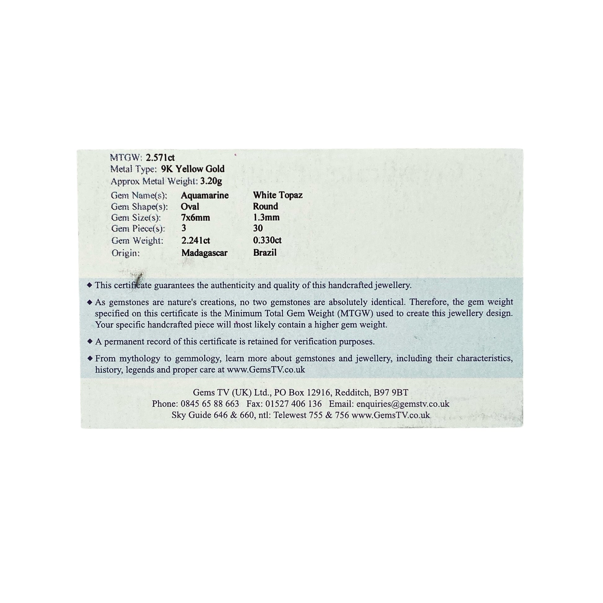Material: Made from polished 9-carat yellow gold, the warm tone beautifully complements the cool clarity of the aquamarine and the brilliance of the white topaz.