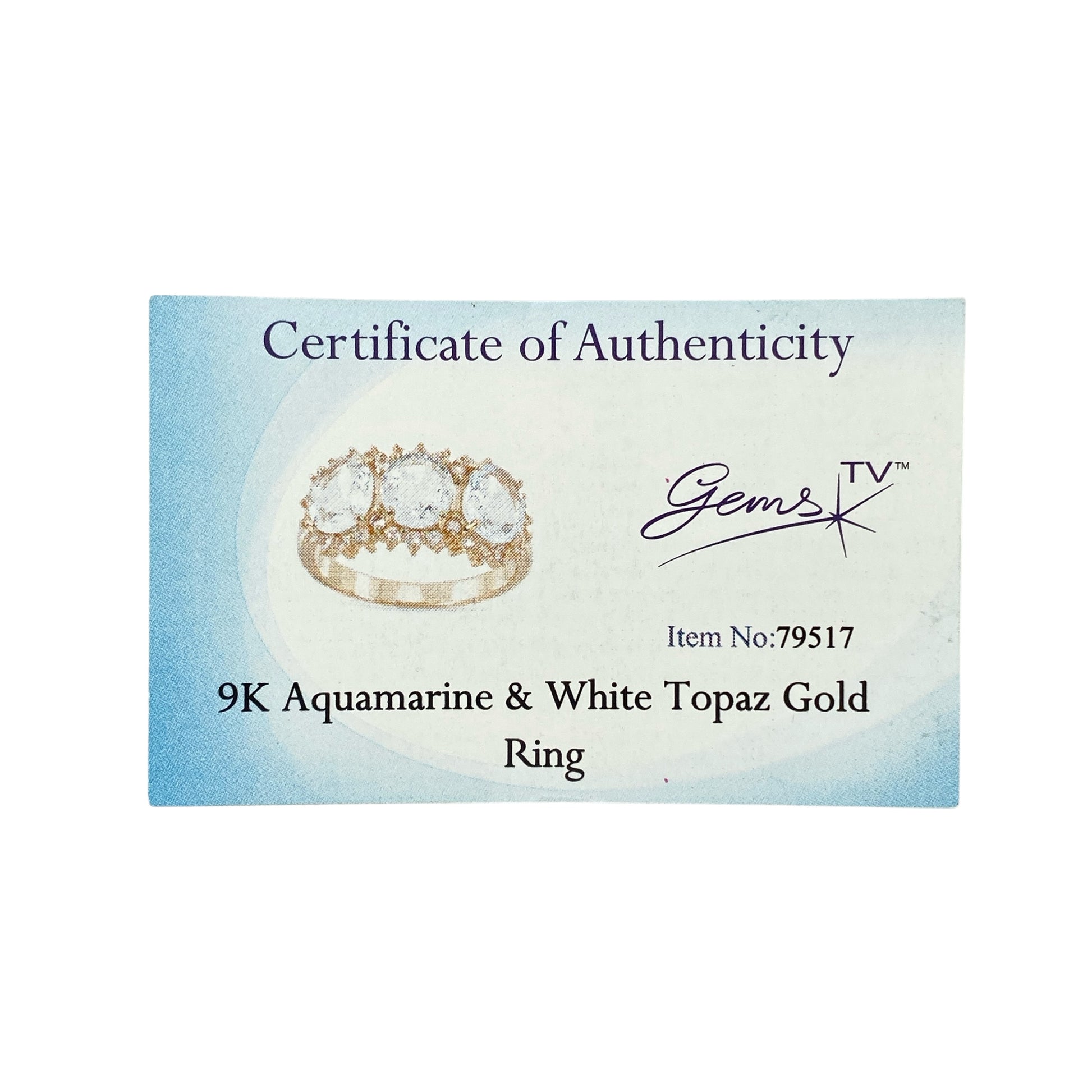 Bring soft colour and refined sparkle to your jewellery collection with this pre-owned 9ct yellow gold aquamarine & white topaz set ring, a graceful design with elegant presence.