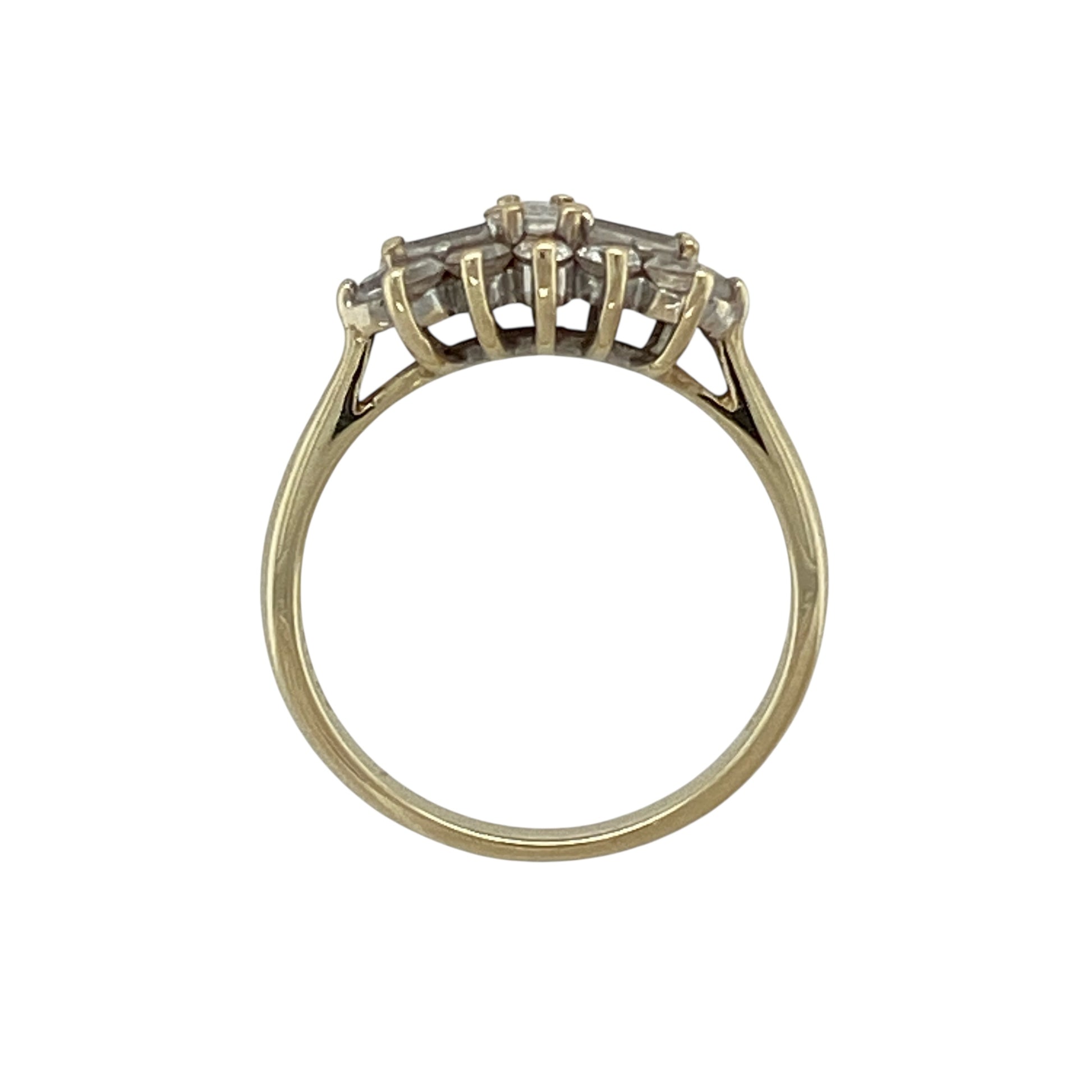 Design: The ring features a cluster arrangement combining brilliant and baguette-cut cubic zirconia stones, creating a striking and dimensional focal point. The decorative front measures 8mm high, offering a balanced and eye-catching presence.
