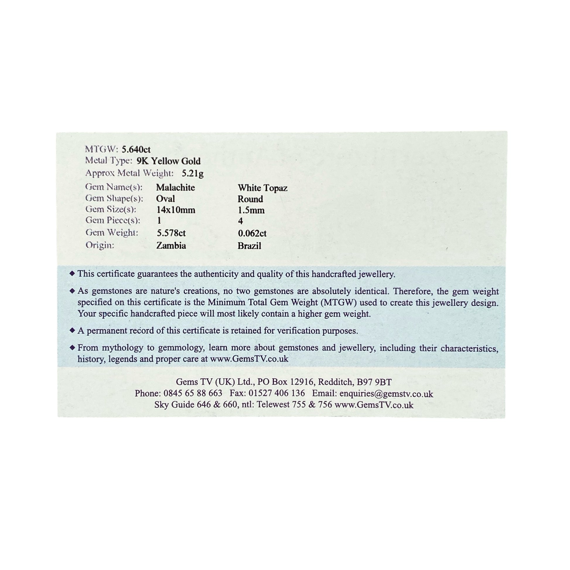 Material: Made from polished 9-carat yellow gold, the warm tone beautifully complements the vibrant green of the malachite and the brilliance of the white topaz.