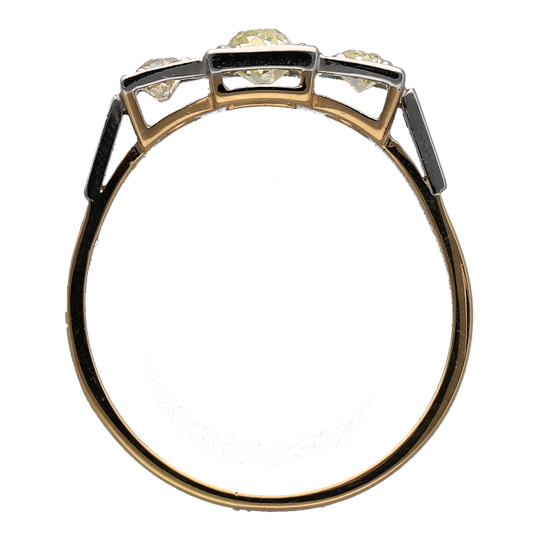 Design: The ring features a classic Art Deco trilogy arrangement, with three old cut diamonds set across the front, reflecting the bold geometry and refined symmetry typical of the era.