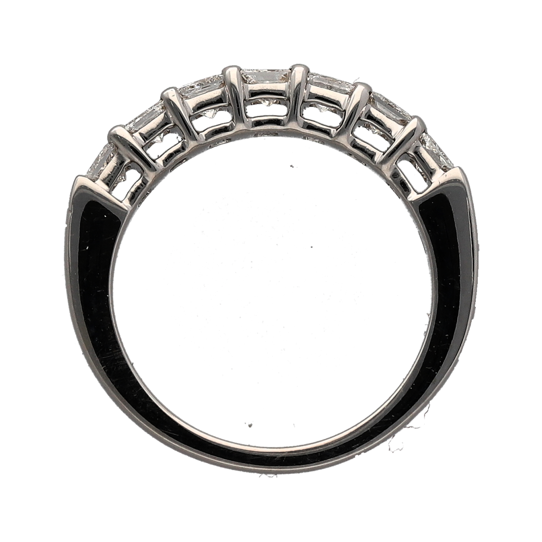Preowned 18ct White Gold & Diamond Set Band Ring in size K with the weight 4.70 grams. The ring is made up of seven princess cut diamonds with approximately 91pt of diamond content in total at approximate clarity Si. The band is approximately 4mm wide at the front