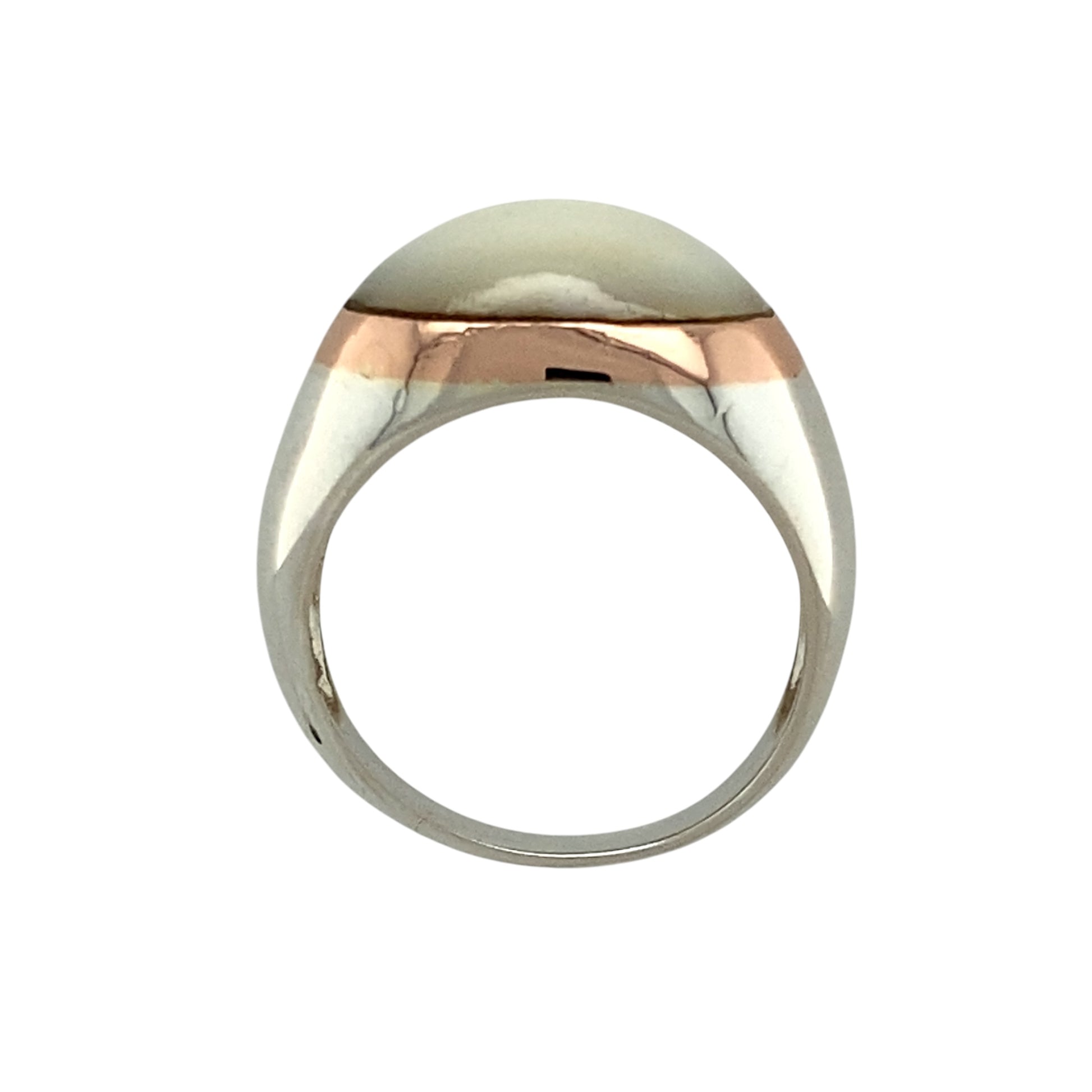 Design: The ring features an elegant 16mm by 10mm oval mother of pearl stone, radiating a soft iridescent sheen that shifts beautifully in the light. The setting is accented with warm 9ct rose gold detailing, creating a harmonious balance of colour and texture in true Clogau style.
