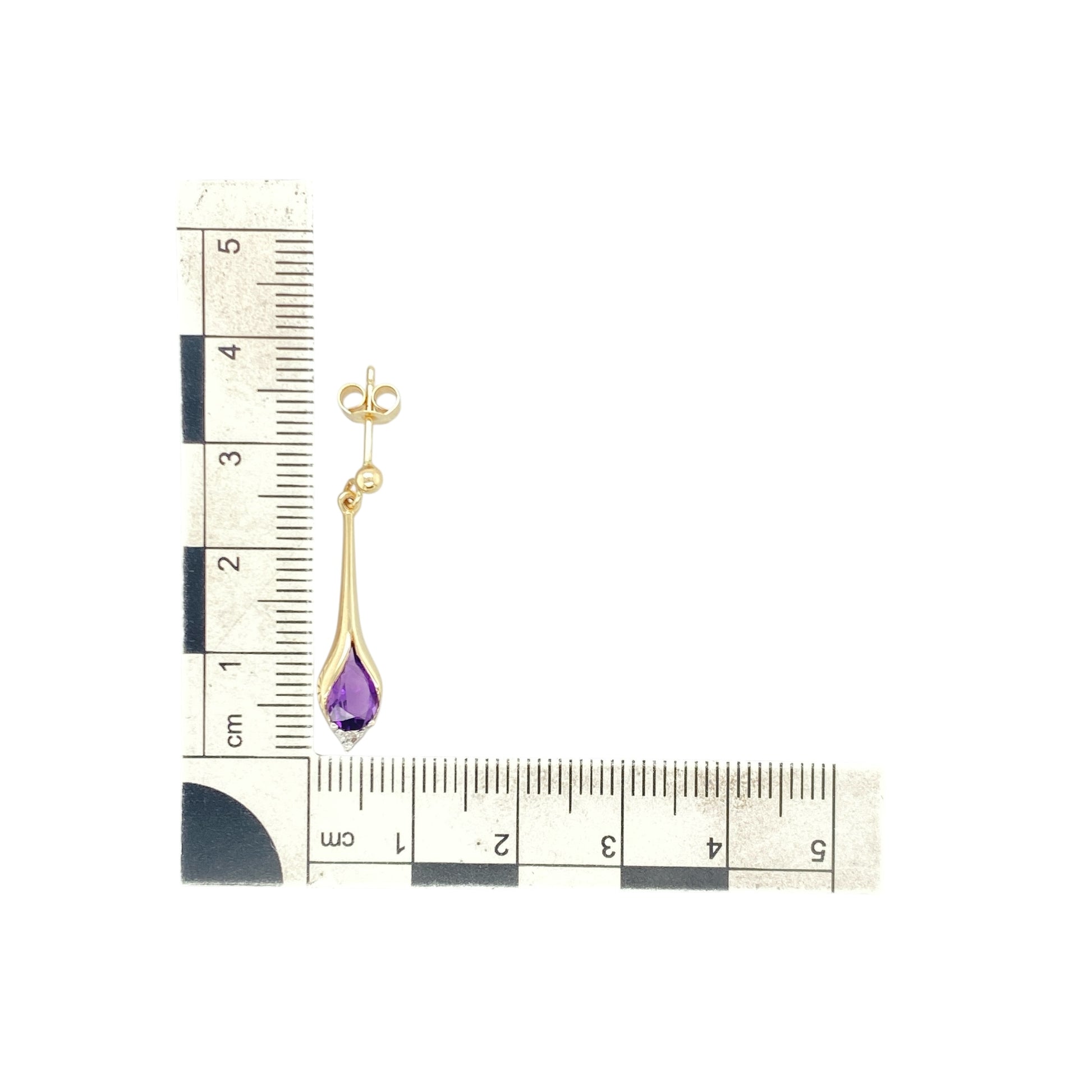 Pre-owned 9ct Yellow Gold Diamond & Amethyst Set Drop Earrings with the weight 2 grams. The amethyst stones are each 8mm by 6mm