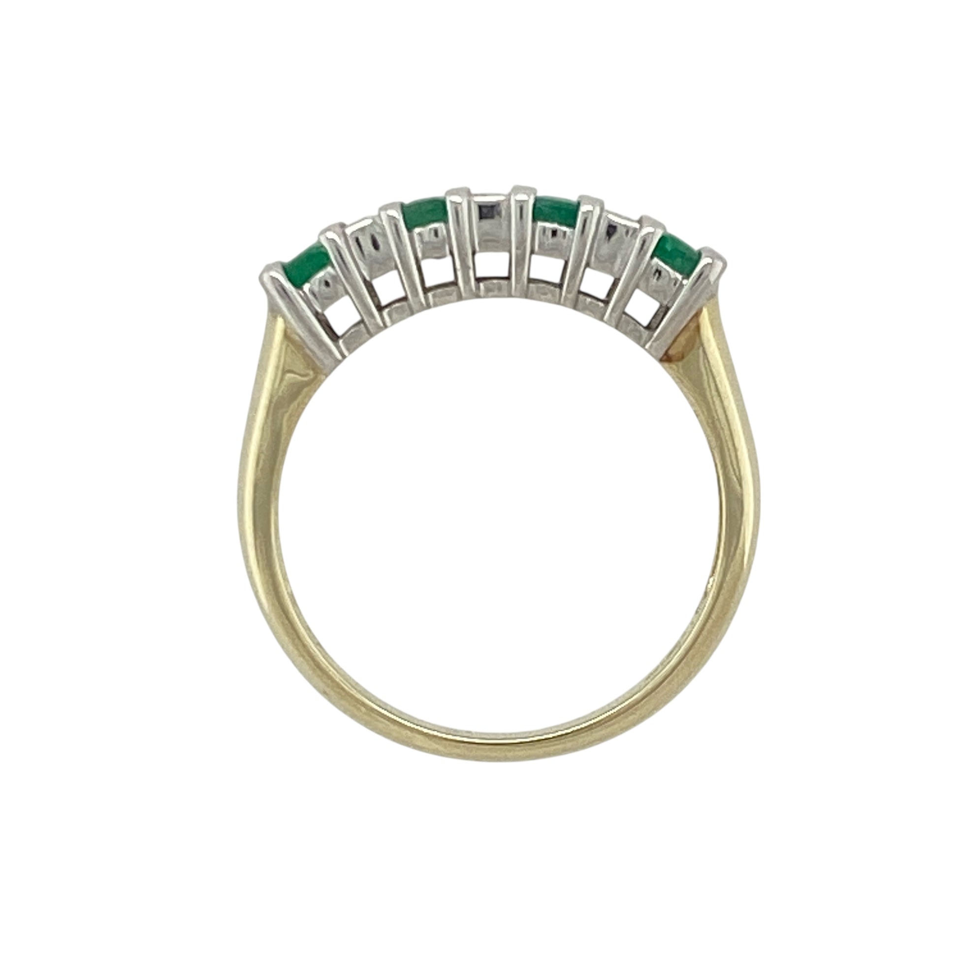 Add rich colour and classic elegance to your collection with this pre-owned 9ct yellow gold diamond and emerald set band ring — a timeless piece that beautifully combines vibrant gemstones with refined sparkle.