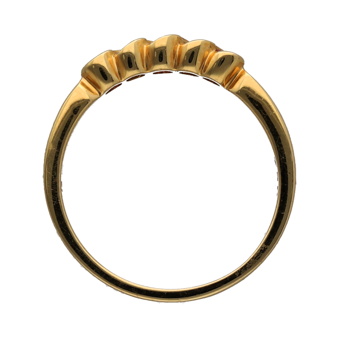 New 18ct Yellow Gold Diamond & Ruby Set Band Ring in size N with the weight 3.30 grams. The ruby stones are each approximately 1.5mm diameter and the front of the band is 3mm wide. There is approximately 0.05ct of diamond content set in the band in total