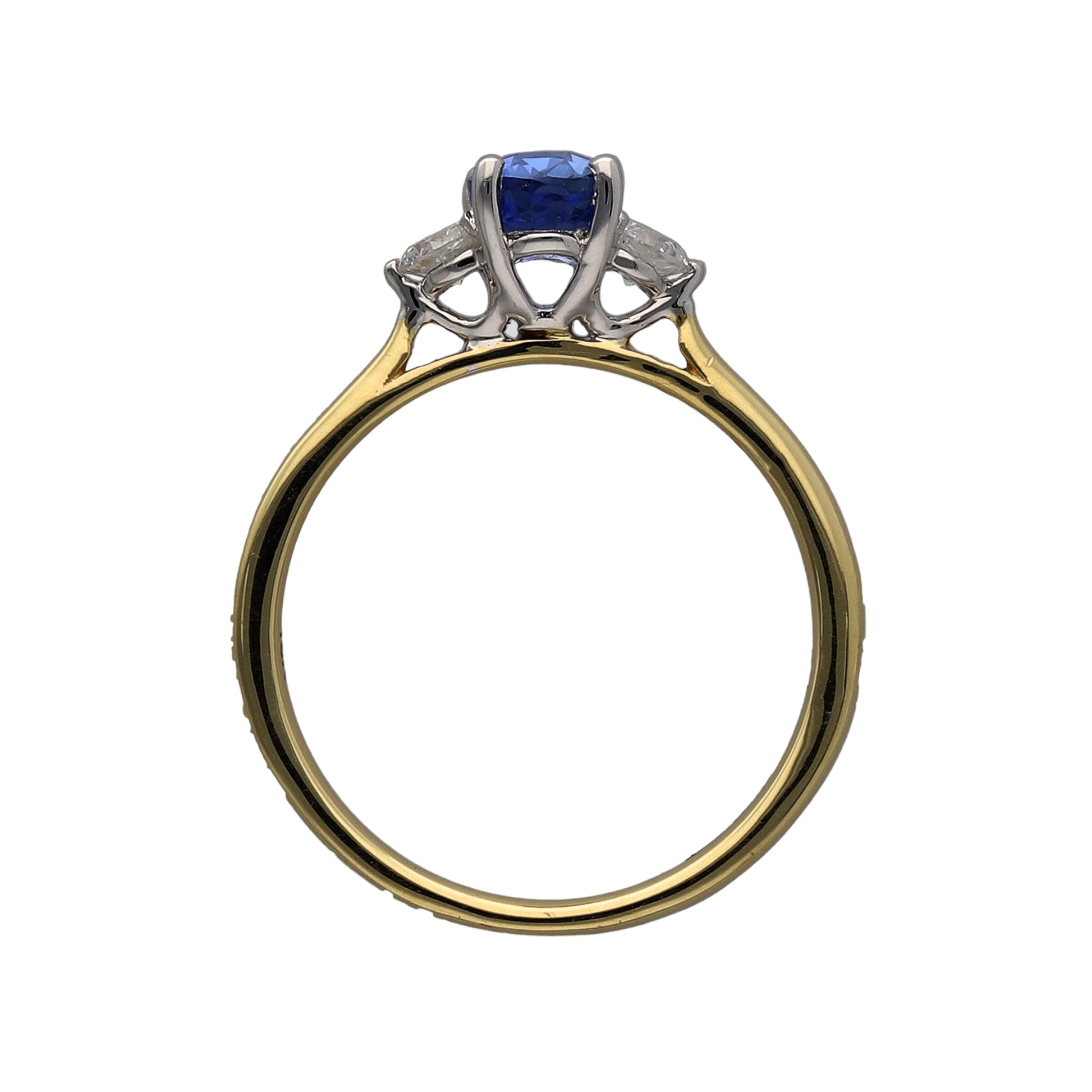 New 18ct Yellow and White Gold Diamond & Sapphire Trilogy Ring in size N with the weight 2.90 grams. The sapphire stone is 7mm by 5mm and there is approximately 25pt of diamond content in total